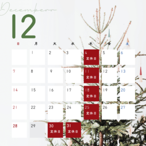 12月は、木曜日を定休日、29日(火)30日(水)を臨時休業日、とさせていただきます